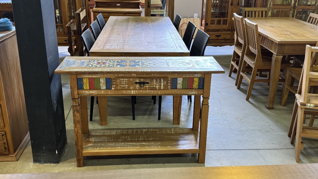 Imagine a cena: seus convidados entram e a primeira coisa que notam é o charme dos ladrilhos hidráulicos no tampo, trazendo uma vibe de "casa de fazenda" chique e cheia de história. Logo abaixo, a gaveta com faixas coloridas vibra, trazendo alegria e um toque artístico que só uma peça rústica e autêntica pode oferecer.